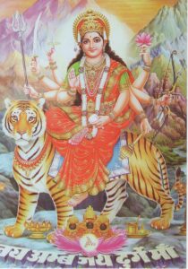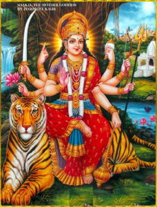 -Cuando se le representa con armas, lleva un trishul (tridente “igual que Shiva”), una concha, un chakra (disco) o una ballesta. Las tres púas del tridente representan las tres gunas: Tamas, Rajas y Sattva. Las armas destruyen la ignorancia, el mal y el ego.